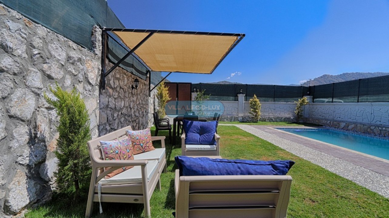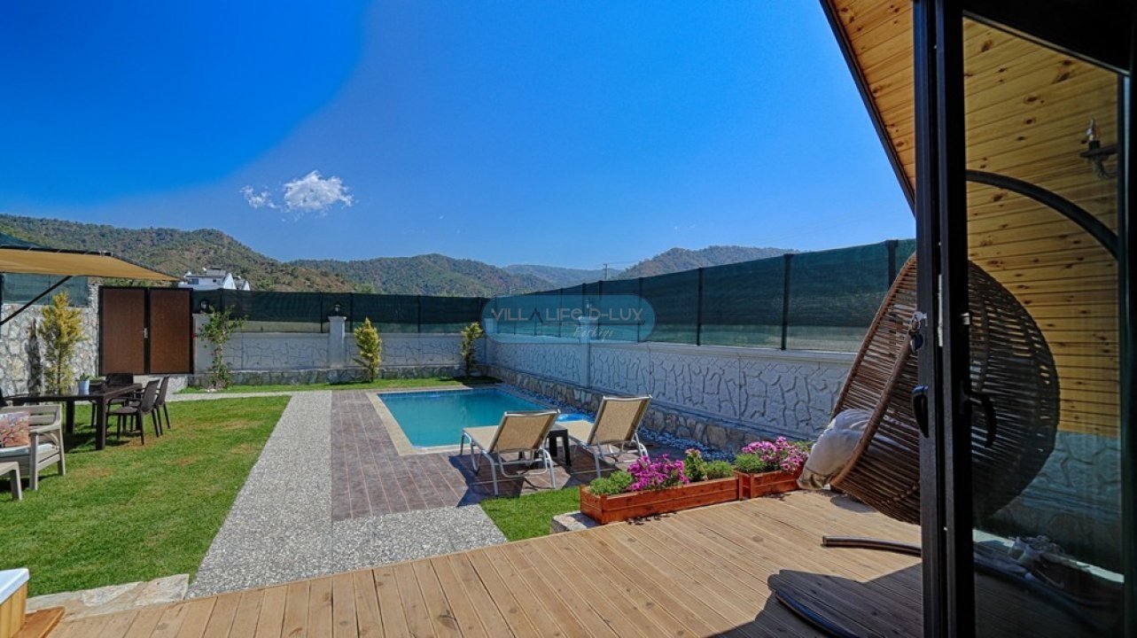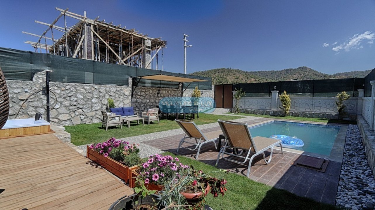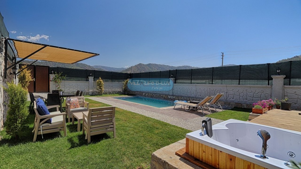 Villa Piramit; Fethiye Karagedik mevkiinde konumlanmış, ahşap üçgen mimarisiyle dikkat çeken, kendi özel bahçesi içinde özel havuzu ve bahçe içinde jakuzisi olan, modern iç dizayna sahip huzurlu ve şirin bir tatil villamızdır. Biri asma katta olmak üzere 2 adet yatak odasına sahip olan villamız 4 kişi konaklama kapasitelidir. Villamız bahçesi, özel havuzu, bahçesinde jakuzisiyle misafirlerimize unutulmaz bir tatil imkanı sunmaktadır. Salon : Zevkle dizayn edilmiş salonumuzda rahat ve şık bir oturma grubu, televizyon, uydu alıcısı, internet erişimi için wi-fi, klima, yemek masası ve sandalyeler bulunmaktadır. Mutfak : Modern Amerikan mutfak içerisinde buzdolabı, çamaşır makinası, bulaşık makinası, fırın, 4lü ocak, kettle, kahve makinası, çaycı, tost makinası, yemek takımı, çatal bıçak seti, tencere ve tava takımı, bardaklar, mutfak araç ve gereçleri bulunmaktadır. Yatak odaları : Villamızda saç kurutma makinası, ütü, ütü masası , 1 adet ortak banyo ve banyoda elektrikli termosifon bulunmaktadır. 1.Yatak Odası: 1 adet çift kişilik yatak, elbise dolabı, komodin, klima, bebek yatağı bulunmaktadır. 2.Yatak Odası: Asma katta bulunan odamızda 1 adet çift kişilik yatak, komodin bulunmaktadır. Havuz : Özel havuzu bulunmaktadır. Havuz Ölçüleri; 6mx3m derinlik 1.55 m.dir. Bahçe : Özel bahçe içinde özel yüzme havuzu, 4 adet şezlong , güneş şemsiyesi, bahçe oturma grubu, cocuk oyun parkı, barbekü bulunmaktadır. İnternet : Villamızda internet erişimi için wi-fi bulunmaktadır. Bölgenin altyapısından dolayı internet servis sağlayıcılarından kaynaklanan ve sezon yoğunluğu sebebi ile aşırı kullanıcı yüklenmesinden dolayı kesintiler olabilmektedir. Hizmetimiz : Villamız temiz bir şekilde misafirlerimize teslim edilmektedir. Misafirlerimiz ekibimiz tarafından karşılanır ve villa anahtar teslimi yapılır. Konaklama süresince bölge hakkında bilgilendirme dahil, herhangi bir konuda, hiç çekinmeden bizden destek alabilirsiniz. Villamızda minimum konaklama süresi 5 gece olup, 5 gece ve altı konaklamalarda 300 TL temizlik ücreti talep edilmektedir. Hasar Depozitosu: Hasar, zayi, kırık, dökük vs. için girişte 500 TL depozito alınmaktadır. Herhangi bir kırık, dökük, zarar, ziyan, kayıp gibi sorun olmadığında depozito, villa çıkışında ekibimiz tarafından iade edilmektedir. Not: Villalarımız genelde doğa içerisinde bulunduğundan, doğal yaşam sürprizleri (sinek,böcek,arı vb)ile karşılaşma ihtimaliniz olabilir.