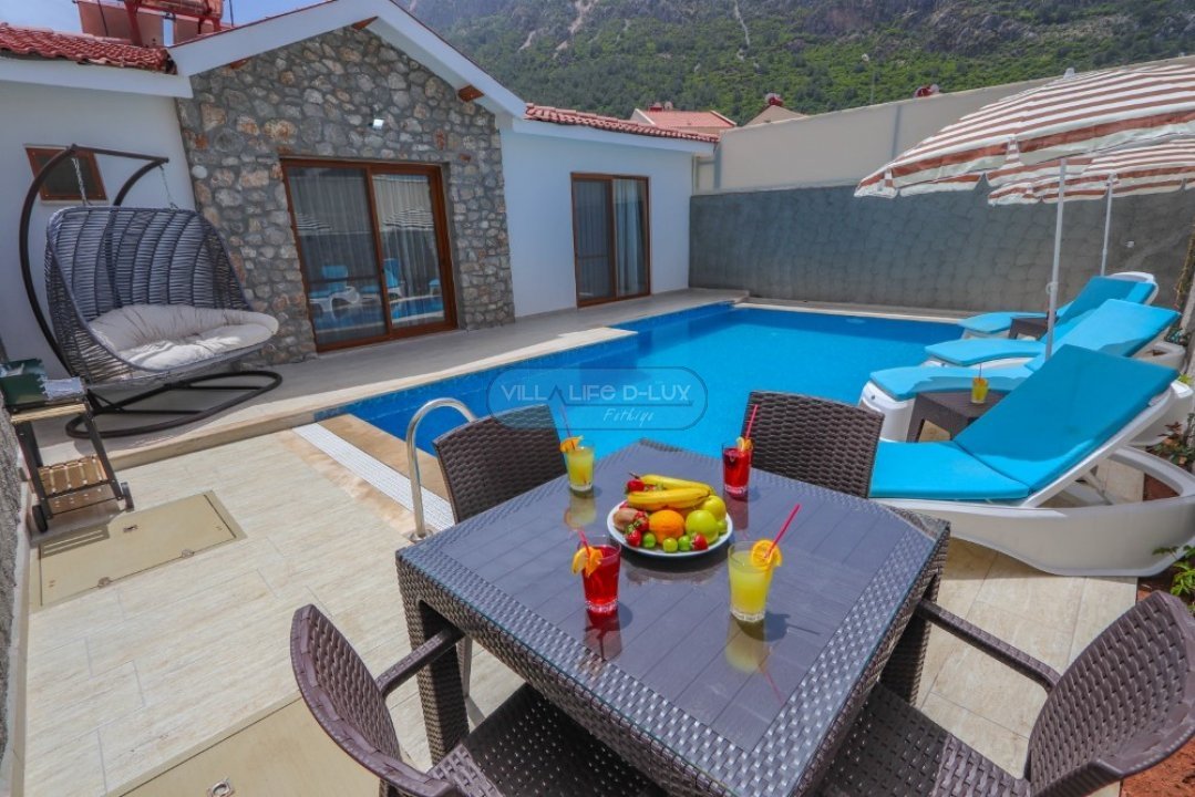 Taş ve ahşap yapıdan oluşmakta olan villamızın içerisi ultra lüks hazırlanmış olup villamız 2 oda 1 açık plan mutfak şeklinde dizayn edilmiştir. Villamızın kendine ait 40m² özel havuzu bulunmaktadır. Havuzun derinliği 1.40cm-150cm aralığında eğimlidir. Havuzumuzun etrafı branda sistemiyle kapalı olup ailenizle rahatlıkla havuz keyfi yapmanızı sağlar.