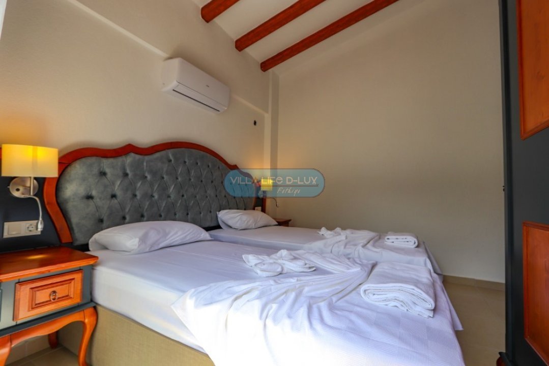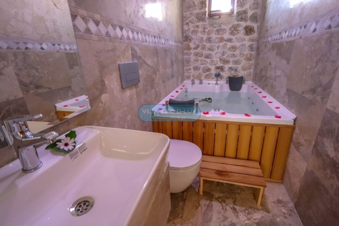 Taş ve ahşap yapıdan oluşmakta olan villamızın içerisi ultra lüks hazırlanmış olup villamız 2 oda 1 açık plan mutfak şeklinde dizayn edilmiştir. Villamızın kendine ait 40 m² özel havuzu bulunmaktadır. Havuzun derinliği 1.40 cm-150 cm aralığında eğimlidir. Havuzumuzun etrafı branda sistemiyle kapalı olup ailenizle rahatlıkla havuz keyfi yapmanızı sağlar.