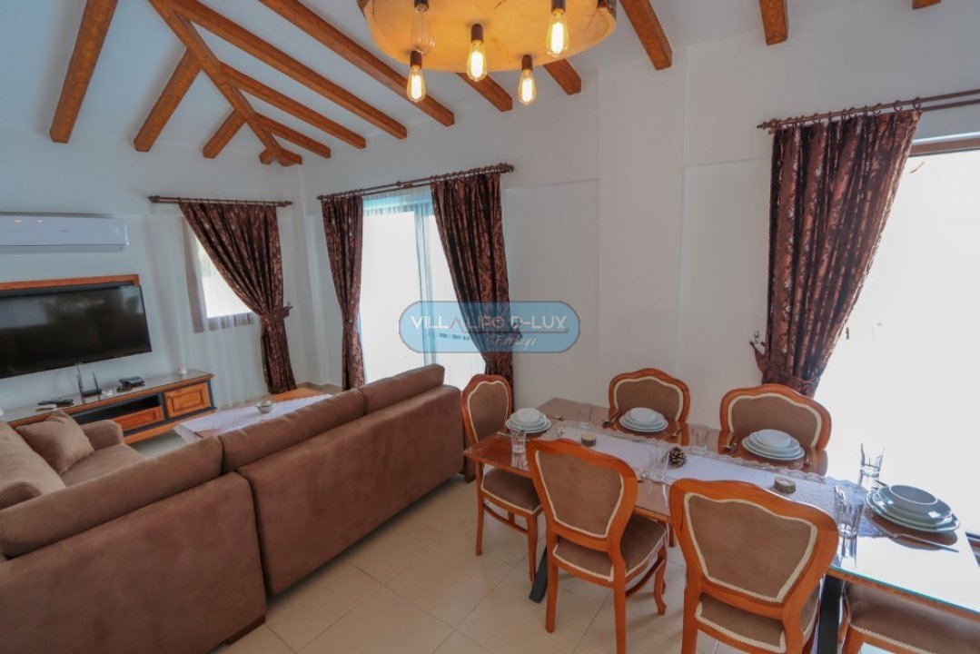 Salon: Modern tasarımlı, özenle dizayn edilmiş salonda şık ve rahat bir oturma grubu, yemek masası ve sandalyeler, televizyon, uydu alıcı, klima bulunmaktadır. Salondan havuz kenarına direkt çıkış bulunmaktadır.
