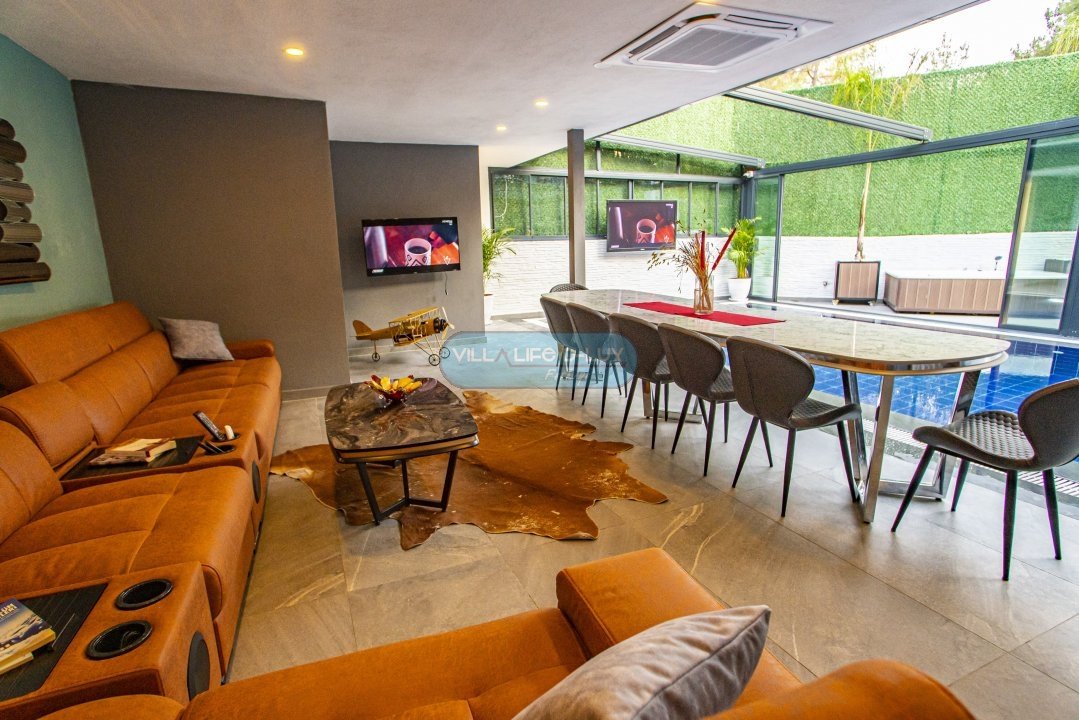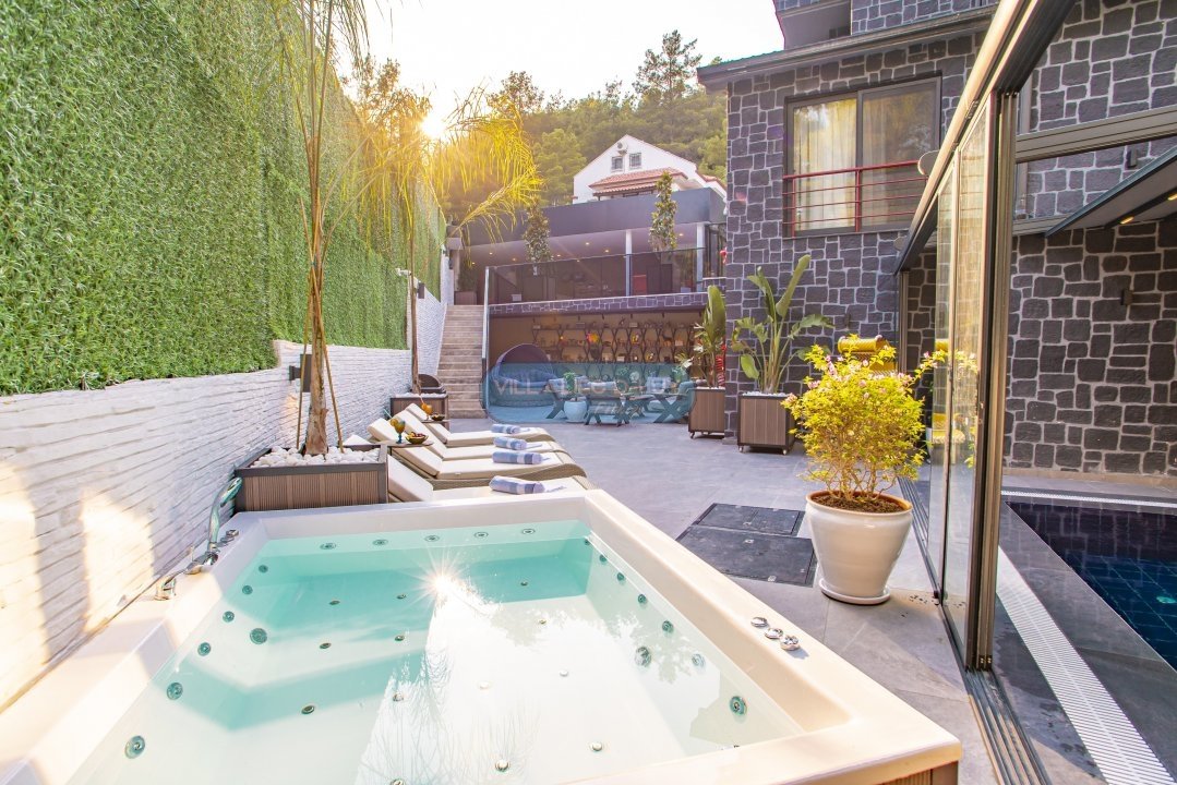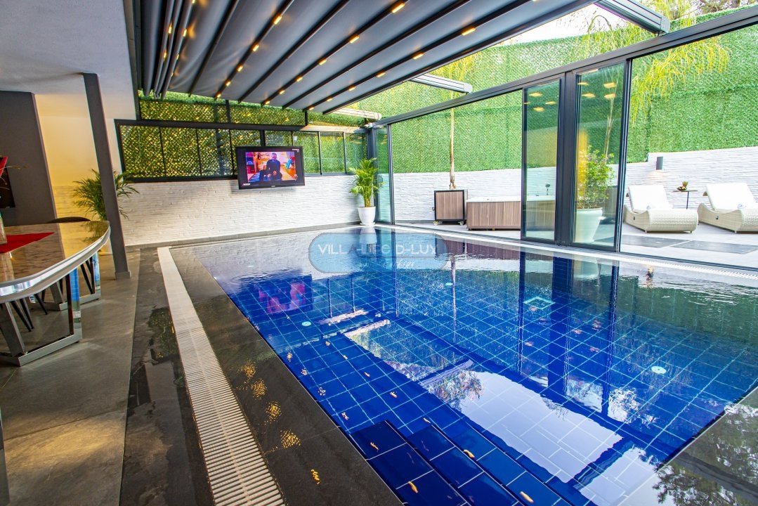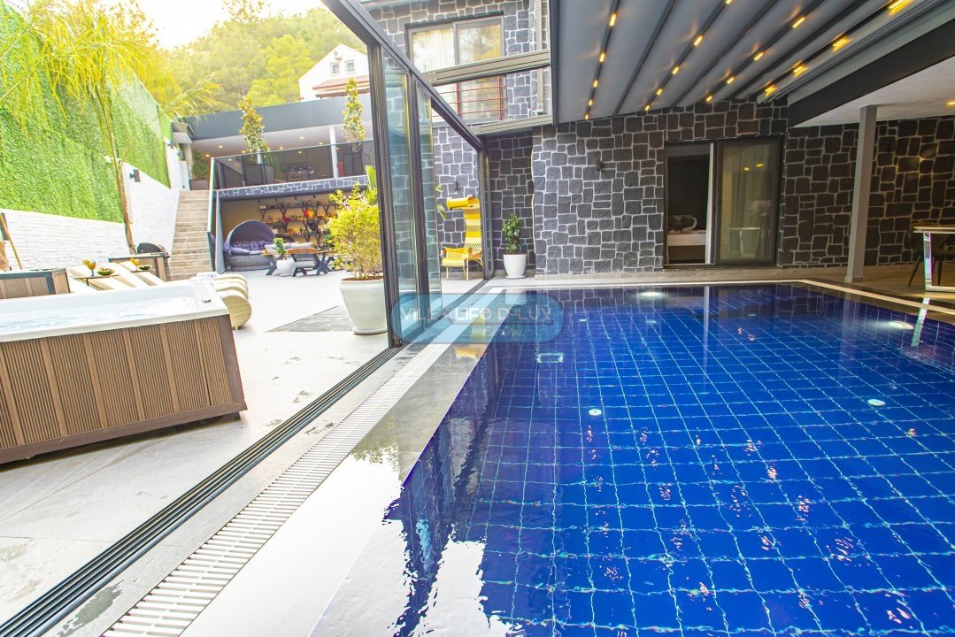 Havuz: Özel üstü açılıp kapanabilen havuz vardır. Villamızın salonu ile yan yana bulunan havuzunun açılıp-kapanabilen sistemi sayesinde, ister salona dahil edilerek kapalı havuz şeklinde, ister üstü açılarak güneşten azami şekilde faydalanılabilecek hale getirilebilmektedir.