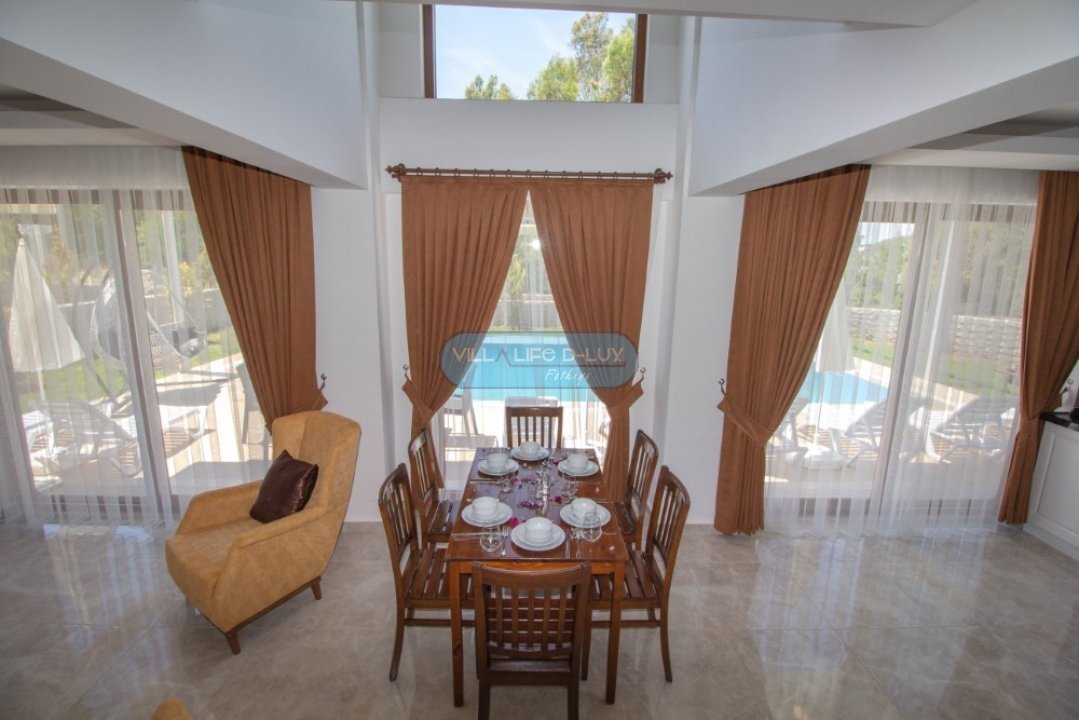 Salon; Modern tasarımlı, özenle dizayn edilmiş salonda şık ve rahat bir oturma grubu, yemek masası ve sandalyeler, televizyon, uydu alıcı, klima bulunmaktadır. Salondan havuz kenarına direkt çıkış bulunmaktadır.