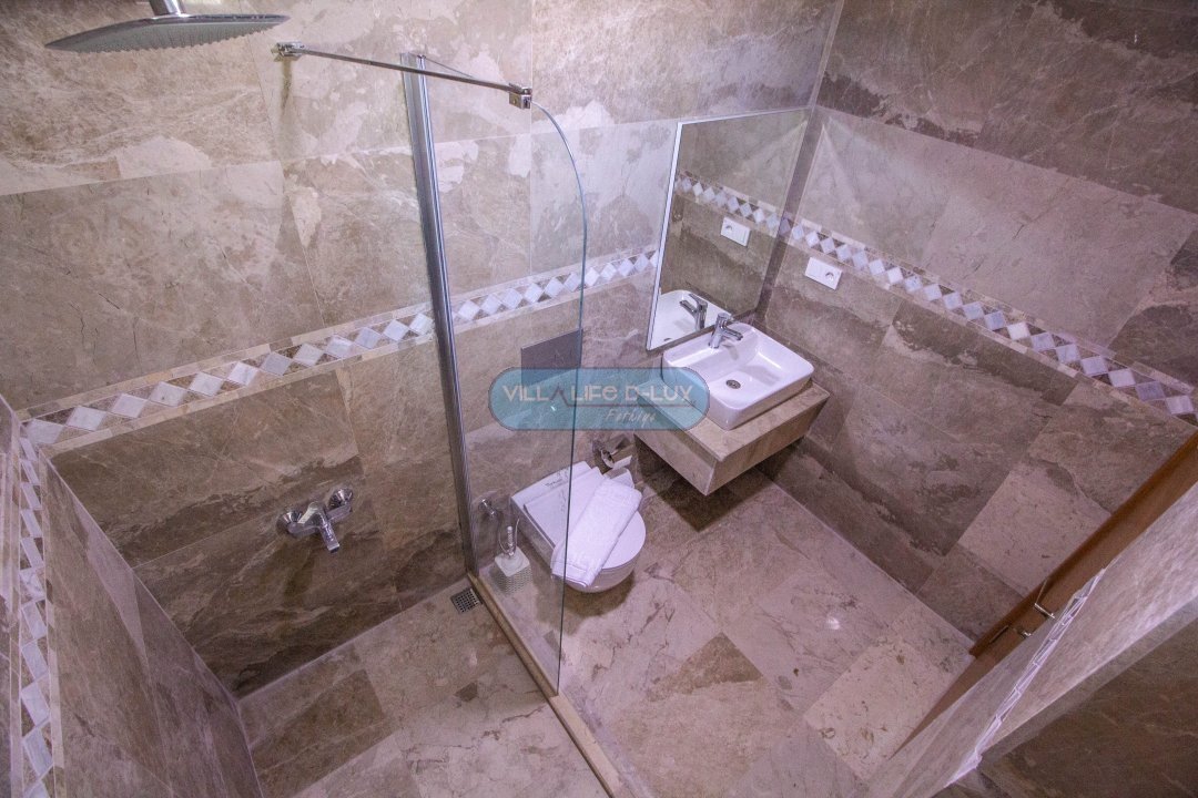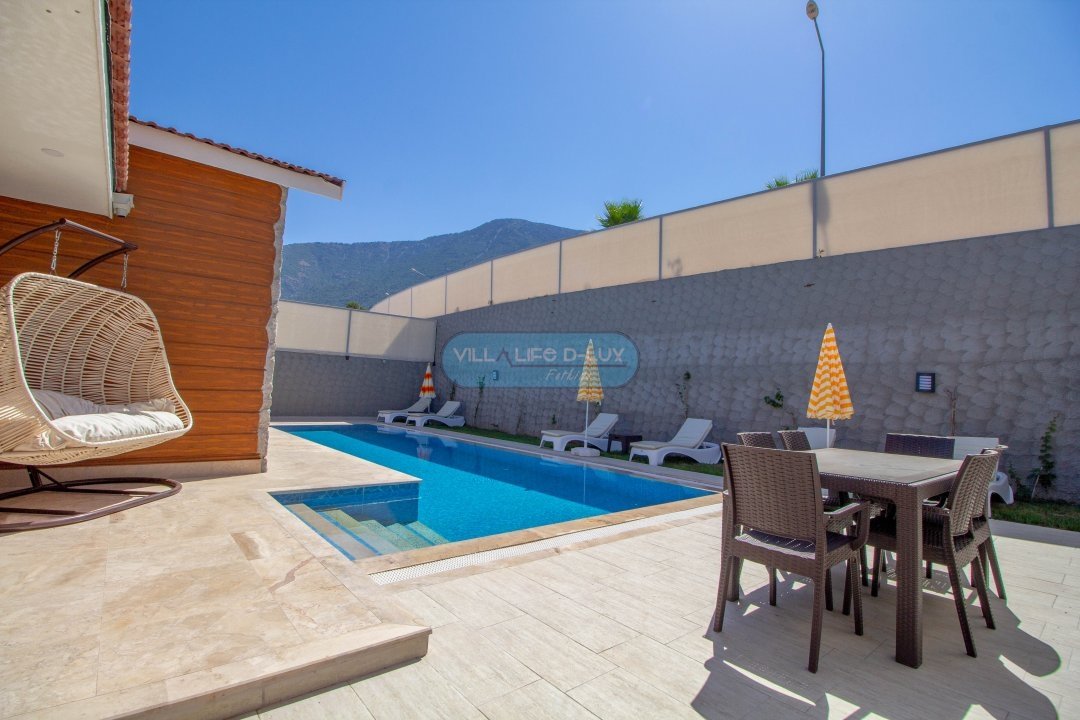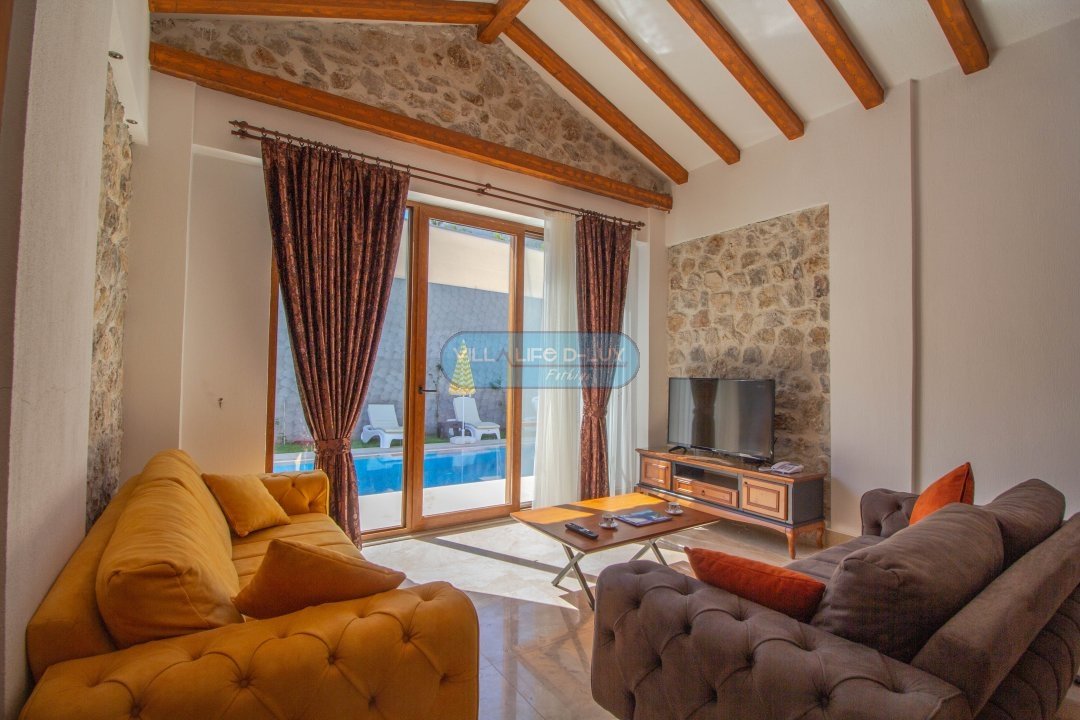 Taş ve ahşap yapıdan oluşmakta olan villamızın içerisi ultra lüks hazırlanmış olup villamız 3 oda, açık plan mutfak ve salon şeklinde dizayn edilmiştir. Villamızın kendine ait korunaklı özel havuzu bulunmaktadır. Havuzun derinliği 1.40 cm-150 cm aralığında eğimlidir. Havuzumuzun etrafı branda sistemiyle kapatılmış olup korunaklı yapısı ile aileniz ile birlikte gözlerden uzak bir tatil geçirmenize olanak sağlamaktadır.