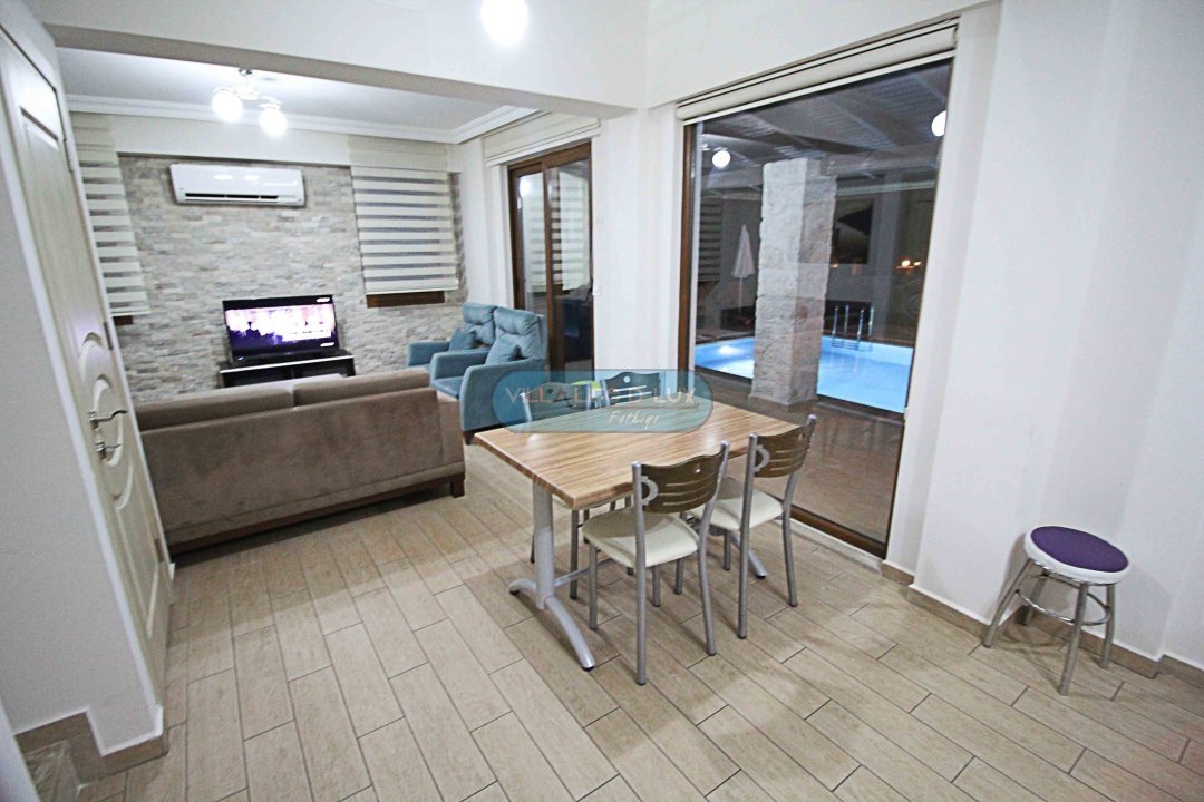Villamızın içerisinde dört adet yatak odası ve dört adet banyo bulunmaktadır. Yatak odalarının iki tanesinde çift kişilik yataklar, diğer yatak odasında ise iki adet tek kişilik yatak bulunmaktadır. Tüm odaların içerisinde klima ve ebeveyn banyosu bulunmaktadır. Ortak alanda salon, mutfak, klima ve televizyon bulunmaktadır. Villamızın havuzu dışarıdan görünmemektedir. Bu özelliği ile muhafazakar aileler için uygun bir seçenektir.