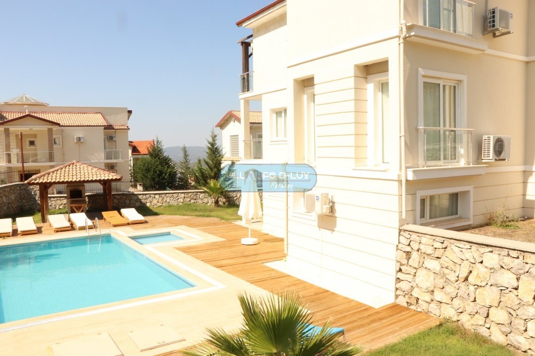 Bahçe : Havuz başında şezlonglar ve güneş şemsiyesi, açık duş, yemek masası ve sandalyeler bulunmaktadır.