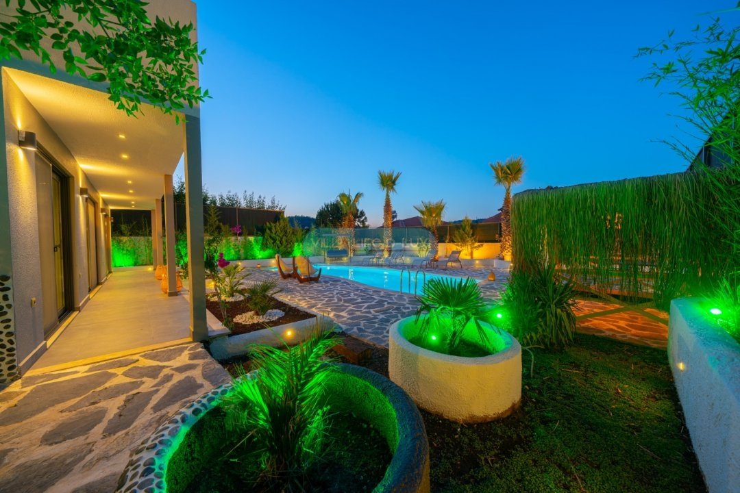 Özel Bahçe : Bahçe içerisinde korunaklı havuz, çardak, şezlong ve güneş şemsiyesi, oturma grubu, masa ve sandalyeler, salıncak, masa tenisi ve bilardo masası bulunmaktadır.