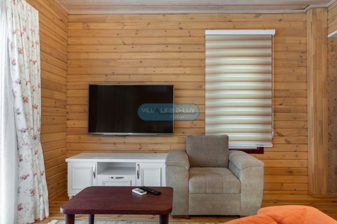 Salon; Modern tasarımlı salonunda şık ve rahat bir oturma grubu, 4 kişilik yemek masası ve sandalyeler, televizyon, uydu alıcı, DVD, klima, ütü, ütü masası, elektrikli süpürge, wc bulunmaktadır. Havuz terasına çıkış bulunmaktadır.