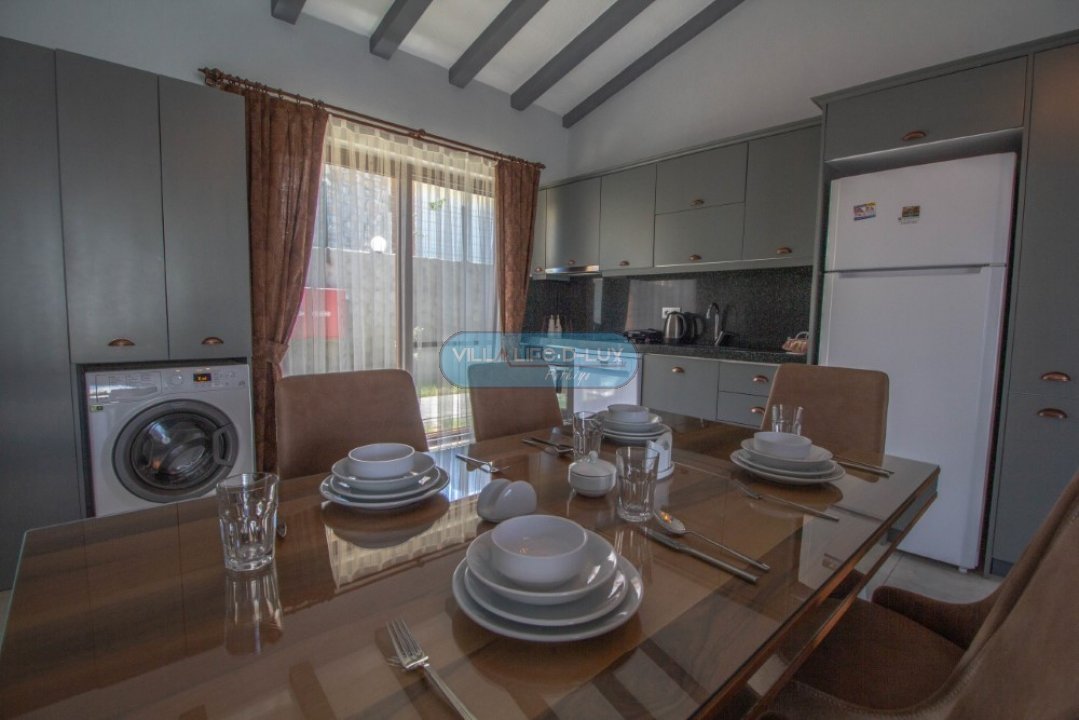 Mutfak; Modern Amerikan mutfakta buzdolabı, çamaşır makinesi, bulaşık makinesi, fırın, ankastre 4lü ocak, elektrikli su ısıtıcısı, yemek takımı, çaydanlık, çatal bıçak seti, tavalar, tencereler, bardaklar bulunmaktadır.