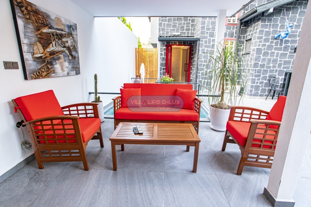 Salon: LCD TV, uydu alıcı, oturma grubu, klima, yemek masası ve sandalyeler bulunmaktadır. Havuz hemen salonun yan tarafında yer almaktadır.