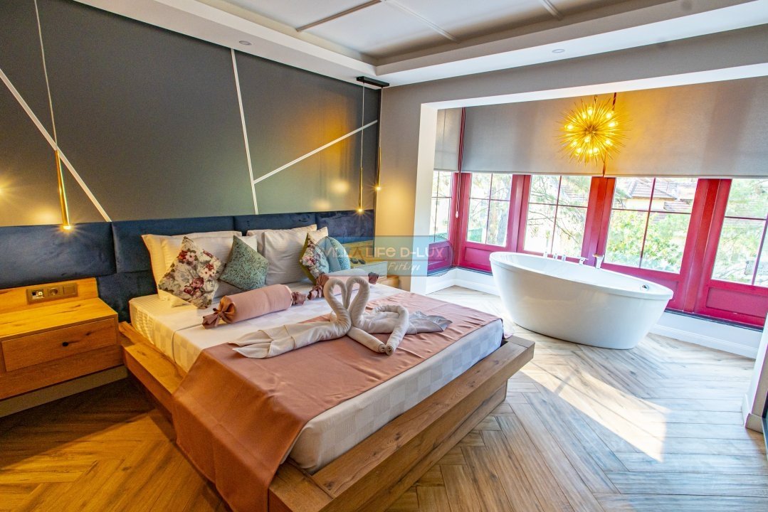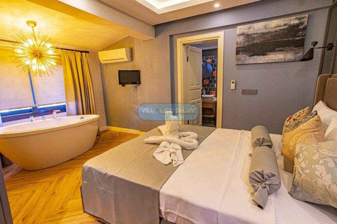 5.Yatak Odası: 1. Katta yer almaktadır. Ana yatak odalarından biridir. Ebeveyn banyolu ve jakuzili oda 1 adet çift kişilik yatak, elbise dolabı, komodin, buzdolabı, LCD TV, saç kurutma makinesi, emanet kasası ve klima bulunmaktadır.