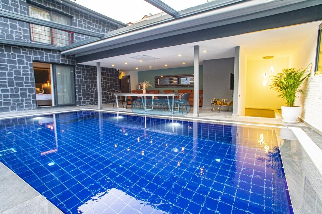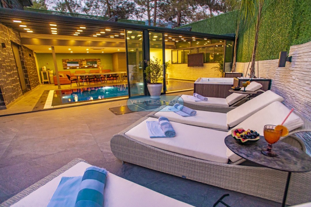 Havuz: Özel üstü açılıp kapanabilen havuz vardır. Villamızın salonu ile yan yana bulunan havuzunun açılıp-kapanabilen sistemi sayesinde, ister salona dahil edilerek kapalı havuz şeklinde, ister üstü açılarak güneşten azami şekilde faydalanılabilecek hale getirilebilmektedir.