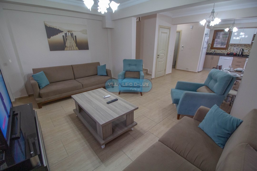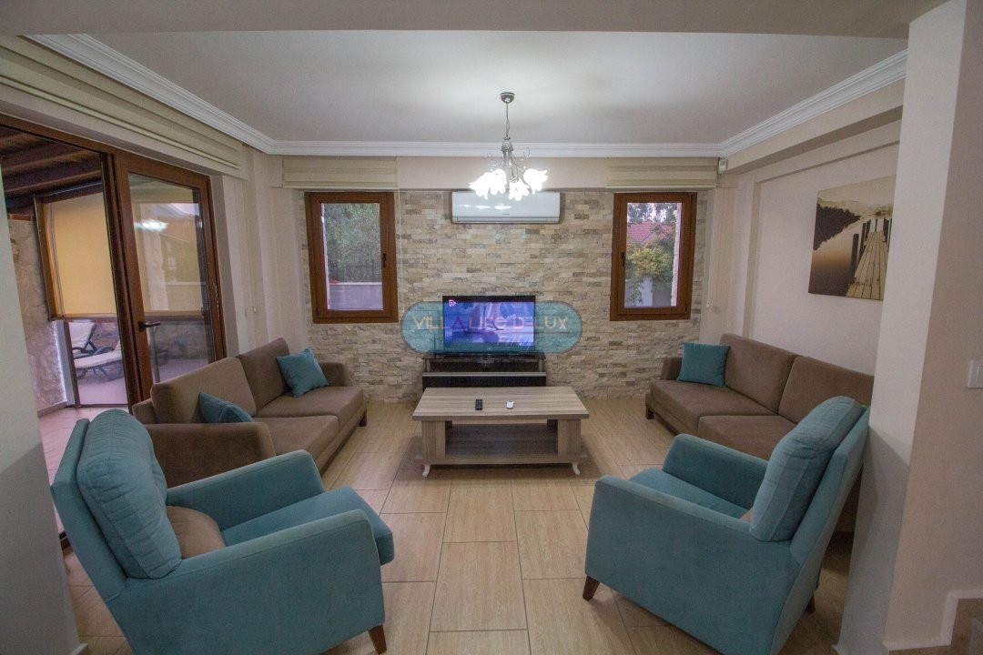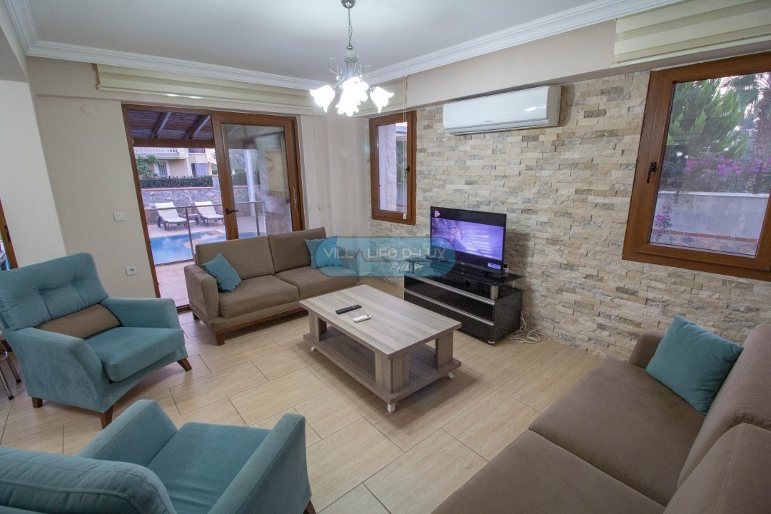 Salon; Modern tasarımlı, özenle dizayn edilmiş salonda şık ve rahat bir oturma grubu, yemek masası ve sandalyeler, televizyon, uydu alıcı, klima bulunmaktadır. Salondan havuz kenarına direkt çıkış bulunmaktadır.