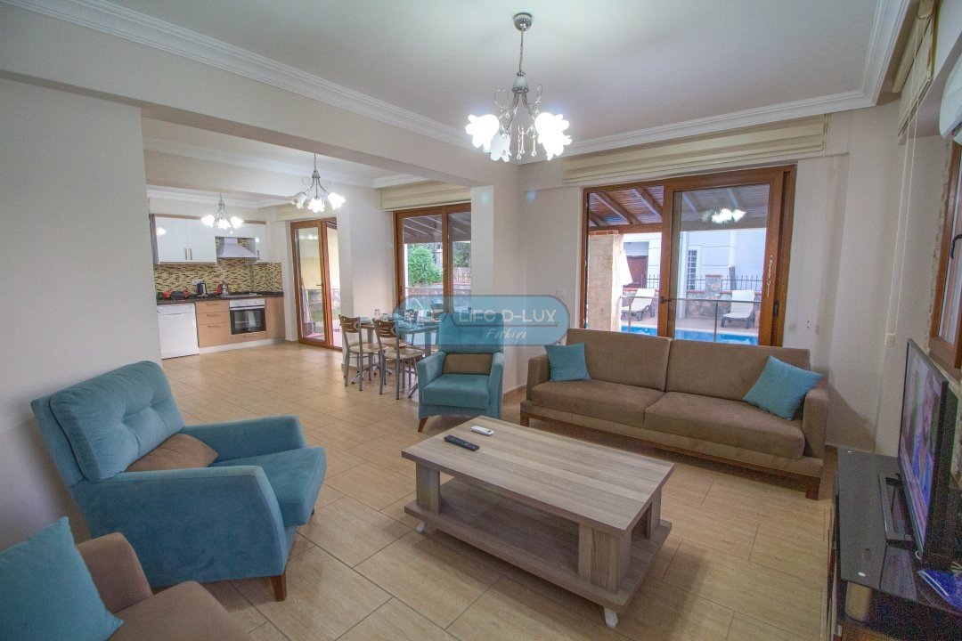 Salon; Modern tasarımlı, özenle dizayn edilmiş salonda şık ve rahat bir oturma grubu, yemek masası ve sandalyeler, televizyon, uydu alıcı, klima bulunmaktadır. Salondan havuz kenarına direkt çıkış bulunmaktadır.