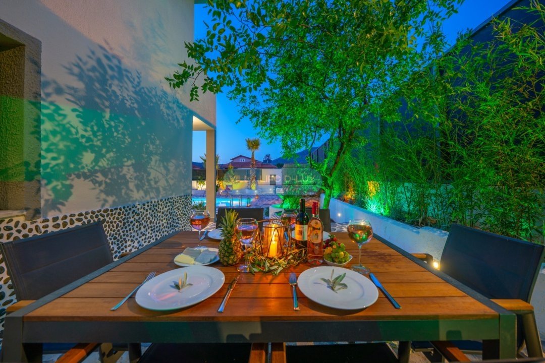 Özel Bahçe : Bahçe içerisinde korunaklı havuz, çardak, şezlong ve güneş şemsiyesi, oturma grubu, masa ve sandalyeler, salıncak, masa tenisi ve bilardo masası bulunmaktadır.